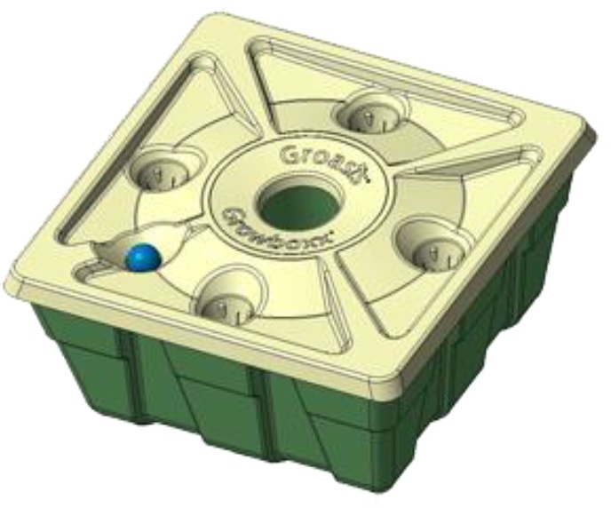 La tecnología Growboxx (Figura 18) también producida por Groasis, fue introducida al proyecto en octubre del 2020. Es una caja cuadrada con un hueco en la mitad, fabricado con pulpa de papel reciclado y puede ser usado para sembrar una sola vez. Se la coloca alrededor de un árbol joven, pero tiene 4 pequeños agujeros en la tapa donde se pueden colocar tierra y semillas para germinarlas hidropónicamente en el agua almacenada en la Growboxx.