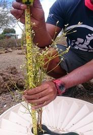 Algunas especies generan múltiples ramas que crecen a diferentes ritmos. Este crecimiento desigual puede confundir a un monitor, por lo que es importante que siempre marque y mida la misma rama para obtener datos precisos (Figura 32). Algunos ejemplos de este tipo de vegetación son: Lycium minimum, Acacia macracantha, Alternanthera filifolia, Ésta última es una de las especies que tiene un eje principal, pero varias ramas que son muy sensibles al tacto y tienden a romperse. Es importante tomar una altura intermedia o promedio donde la mayoría de las ramas hayan alcanzado su altura máxima (Figura 33).