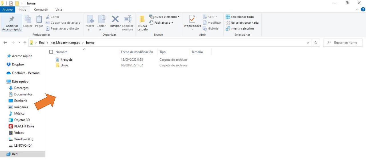 - Abre tu Explorador de Archivos y en Documentos, pega la siguiente ruta \\nas1.fcdarwin.org.ec\home y dale ENTER.