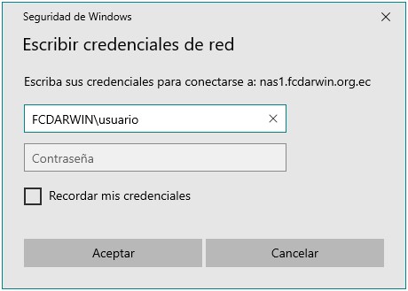 - Si tu computadora es personal, te aparecerá esta ventana emergente, en donde tendrás que introducir tu usuario, anteponiendo FCDARWIN\; luego digita tu contraseña y dale Aceptar :