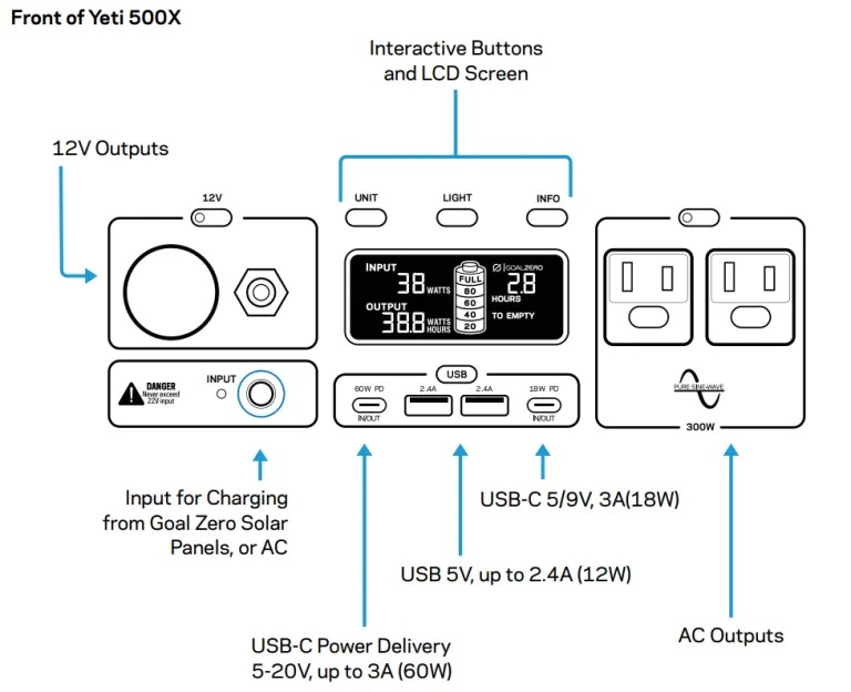 Al presionar el botón UNIDADES, se desplazará a través de diferentes configuraciones de salida y consumo de energía. Al presionar y mantener presionado el botón UNITS se reiniciará el contador de salida de WATT HOUR. Al presionar el botón INFO, la pantalla alternará entre mostrar el estado detallado de la batería y el porcentaje de carga.tage y el tiempo para vaciar / llenar.