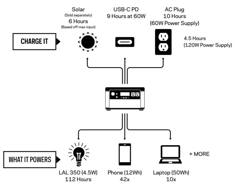 Cuando cargue equipo con la batería, tome nota de la pantalla LCD de la batería. Si conecta dispositivos que tienen un alto requerimiento de energía, el nivel de carga podría caer muy rápidamente y es posible que no obtenga exactamente 500Wh de energía. Además, especialmente cuando se usa la salida de energía de CA, la batería solar convertirá la energía de la energía de CC de la batería en la energía de CA que necesita su dispositivo. Aunque la batería solar tiene un inversor de alta eficiencia, todavía se pierde algo de energía en la conversión y no obtendrá la capacidad nominal completa de la batería.