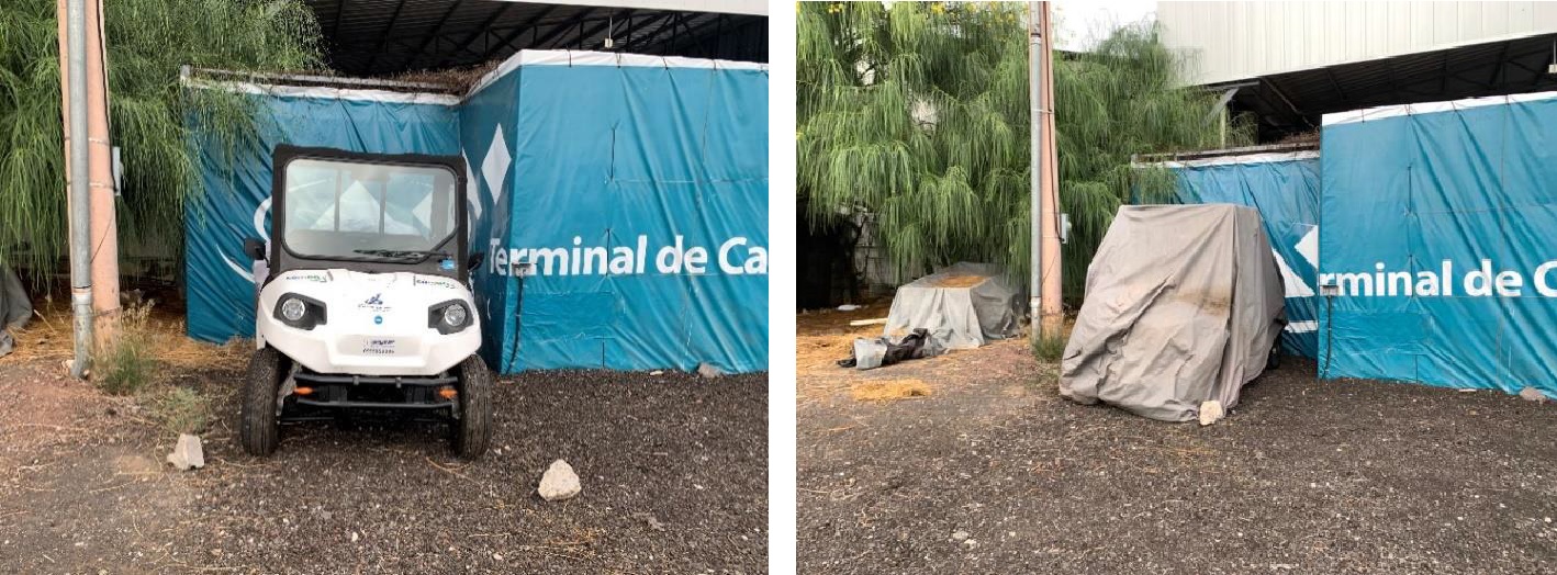 GV2050 tiene un automóvil eléctrico ubicado en Baltra para poder viajar y transportar materiales fácilmente entre los sitios de estudio. El auto tiene un remolque desmontable. El automóvil está ubicado en la Puerta 3 del sitio de carga del aeropuerto junto a su punto de carga (Figura 40), sin embargo, la FAE permite a veces que el automóvil se almacene y cargue por la noche durante nuestra estadía allí. Para abrir la Puerta 3, es posible que sea necesario contactar a William Tirado de ECOGAL.